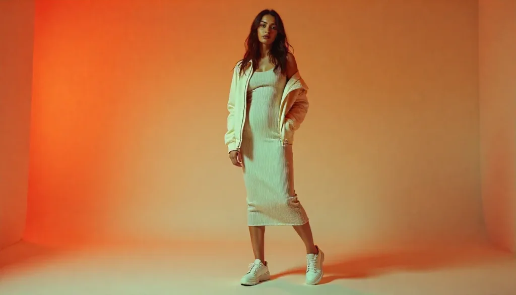 Bold outdoor outfits rely on silhouette more than embellishment. Imagine a high slit skirt paired with a simple top, the wind moving fabric like energy. Or a monochrome bodycon dress under a long coat, revealing shape while controlled by modest outer layering. Your power is not in skin it is in structure.