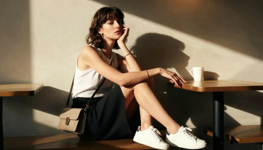 A coffee date might seem like a place for soft neutrals or simple jeans but bold minimalism thrives here too. Imagine black trousers tailored so well they look sculpted. A white fitted bodysuit or ribbed tank that reveals collarbone and shoulder line with quiet sensuality. Leather boots, thick-heeled and confident. No prints, no bright colors just power dressed as simplicity.