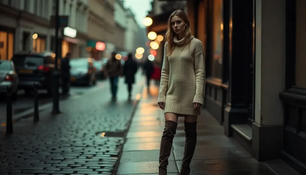 - Thigh-high boots add warmth and sophistication